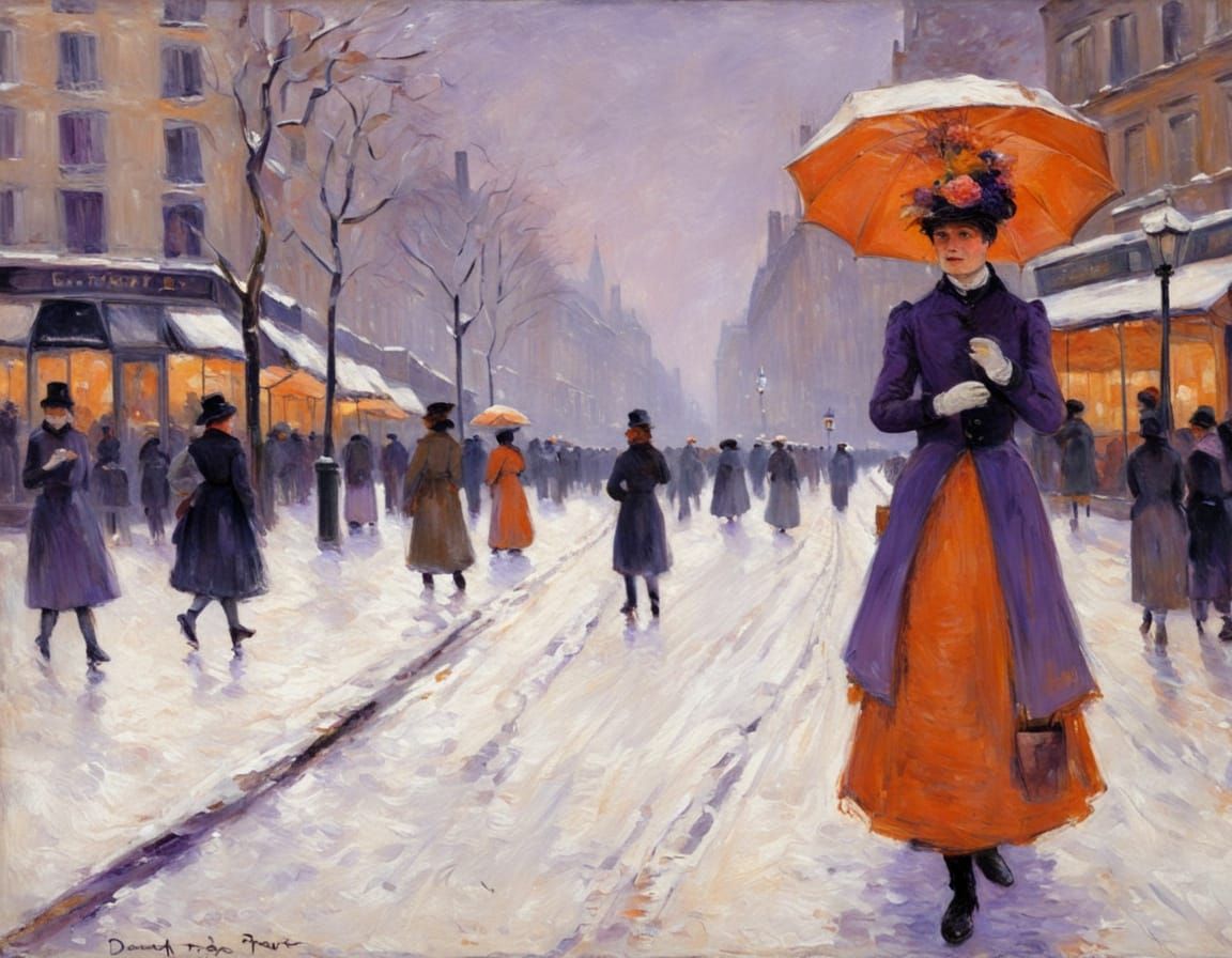 A winter scene in 19th century Paris, painted in the style of Impressionism, with a prominent female figure standing out against a backdrop of snow-covered buildings and vibrant purple and orange hues.