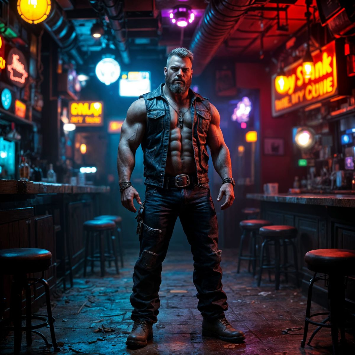 beautiful 30-year-old hairy muscular redneck male wearing a leather vest, denim jeans and engineer boots