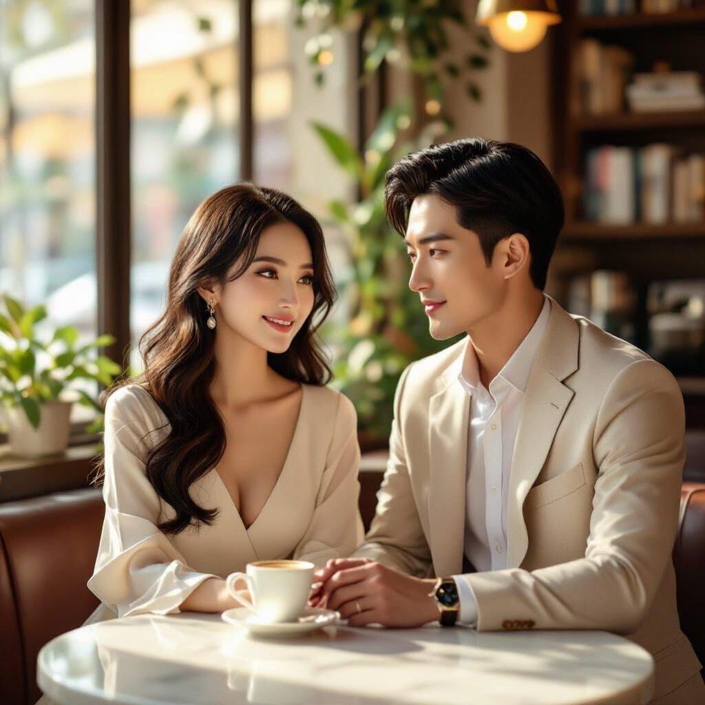 This image shows a romantic couple in a sunlit Korean cafe. The woman wears a cream dress and the man a blazer. Soft lighting and bokeh create a dreamy, photorealistic atmosphere.