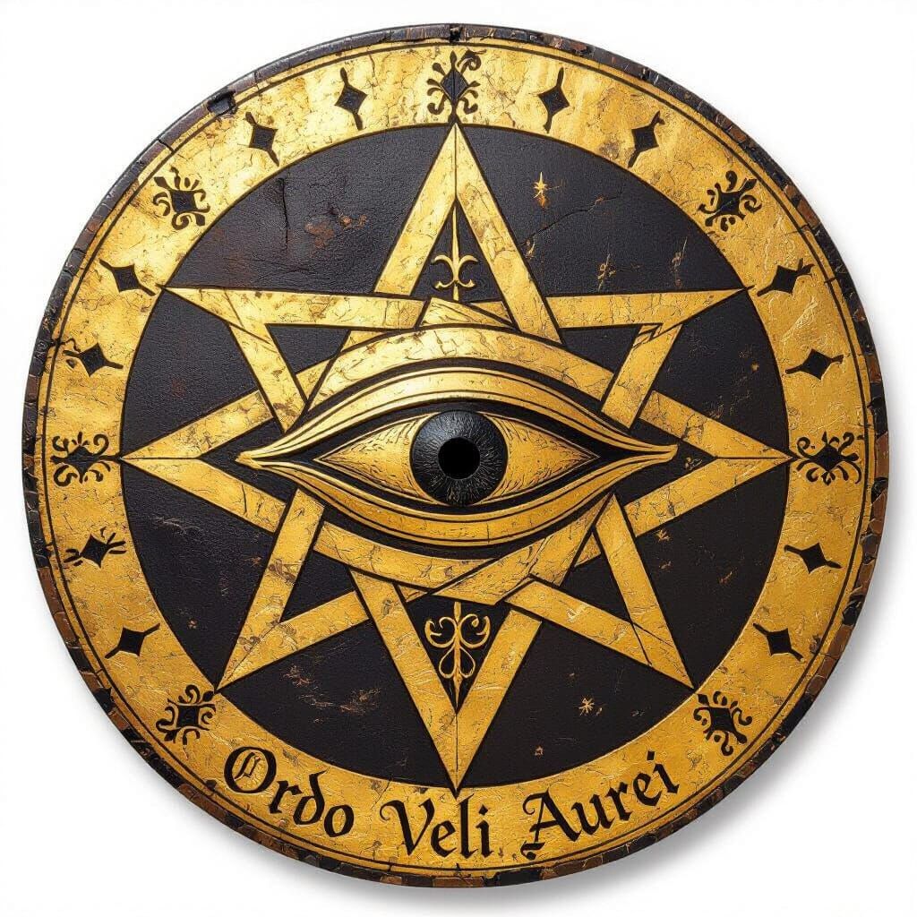 A striking picture of a medieval shield featuring a spiraling golden veil partially covering a stylized closed eye. The design incorporates an inverted heptagram and hermetic symbols, rendered with textures reminiscent of aged metal and parchment.