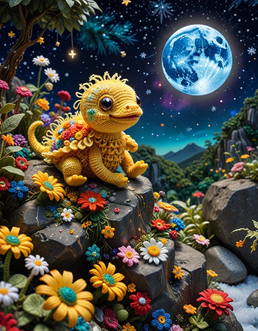 This image shows a full moon and the Flying Spaghetti Monster on a ledge. Extinct animals, a duckling, and vibrant flowers are present in a Klimt-inspired crocheted style.