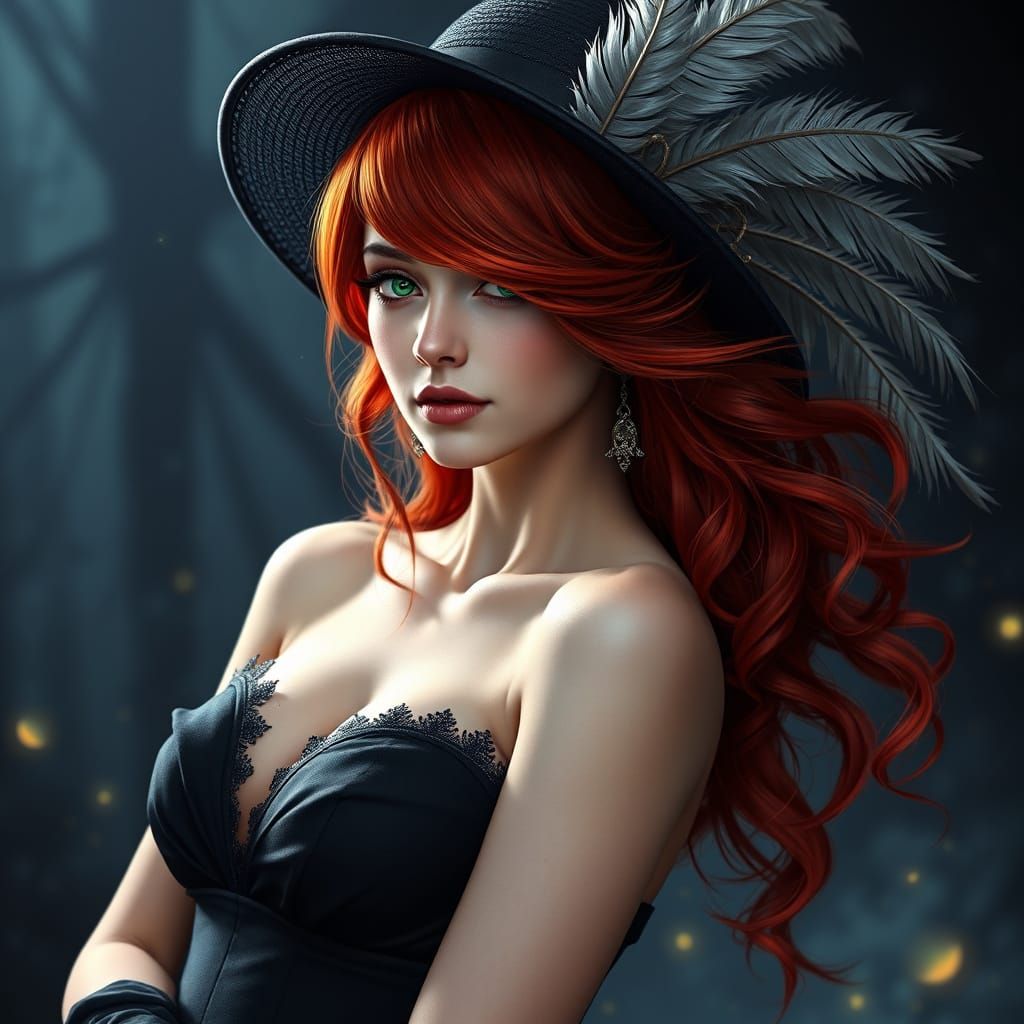 A photorealistic photo of a beautiful woman, wearing a black hat adorned with silver feathers. She has red hair and green eyes. Wearing a black cocktail dress