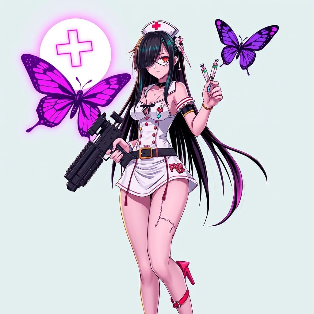 This image shows a dynamic anime girl villain with straight black and rainbow hair, wearing a nurse-style outfit and holding a machine gun, under the control of a mystical purple butterfly with vibrant, neon colors and dynamic lines, reminiscent of a fusion of Takashi Murakami, Ash Thorp, and Loish's sty...