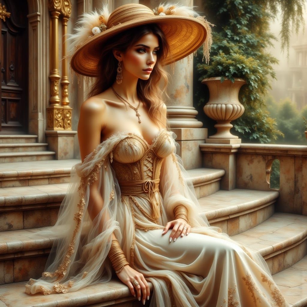 A serene portrait of a refined woman in a lavish Renaissance-inspired setting, evoking the styles of Titian and Caravaggio, with intricate details and soft, diffused light, reminiscent of a misty dawn.