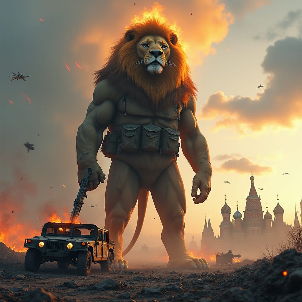 A powerful lion, dressed in Ukrainian military gear, stands tall with a machine gun, surveying a devastated landscape with a ruined military base and smoldering wreckage in the foreground, set against a backdrop of fighter planes and a burning Kremlin, created in 8K resolution with Unreal Engine 5