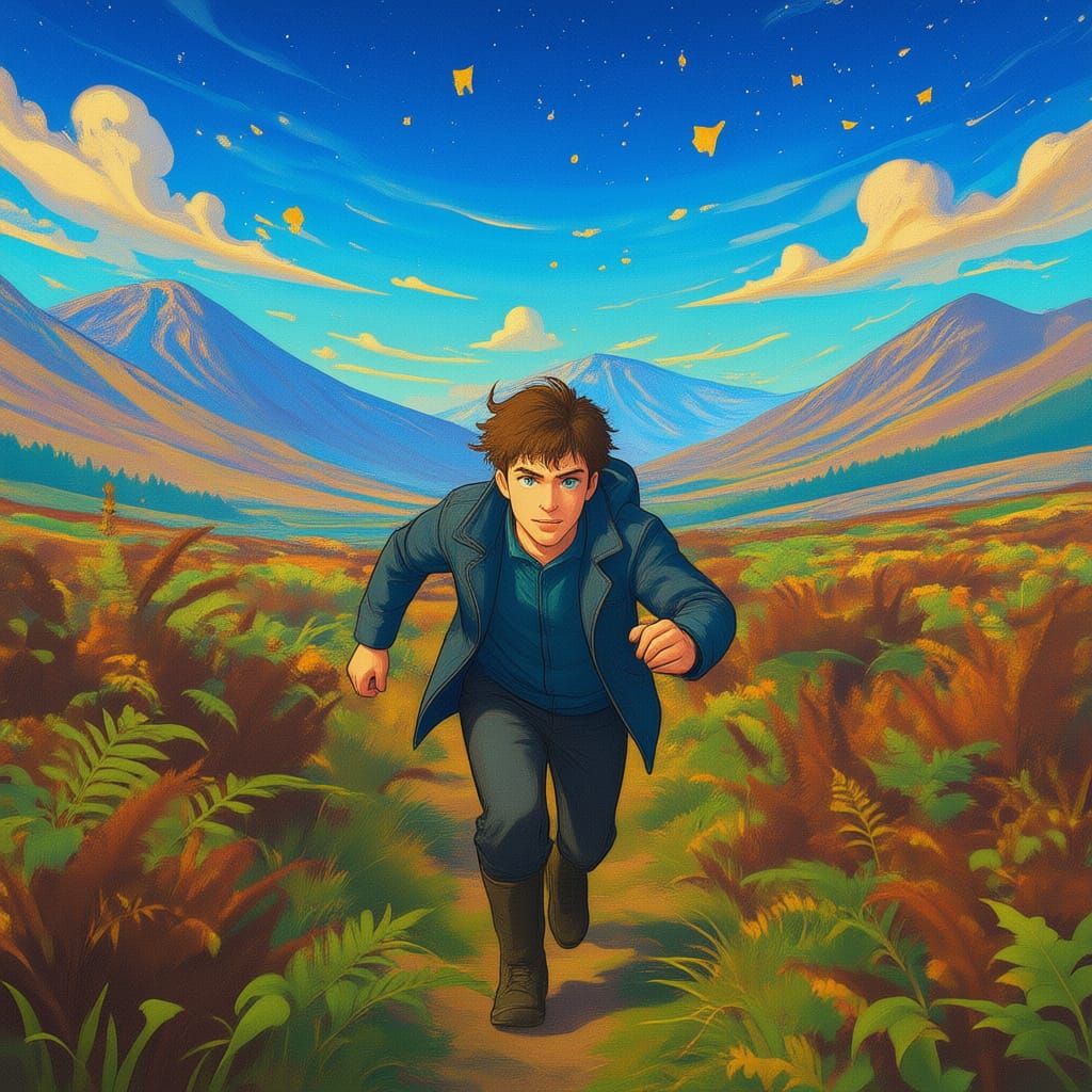 This image shows a lone figure struggling through the vast, untamed Scottish Highlands, surrounded by dense ferns and gorse under a cloudy, misty sky, rendered in a whimsical digital illustration style.