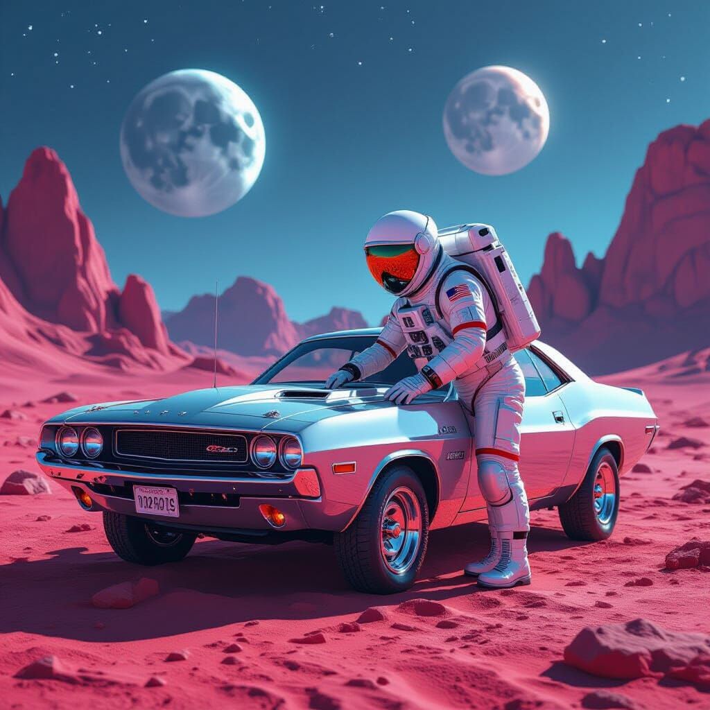 A photorealistic image shows an astronaut polishing a 1970 Dodge Challenger on a vibrant alien world with twin moons. Cinematic lighting and high detail create a humorous sci-fi scene.