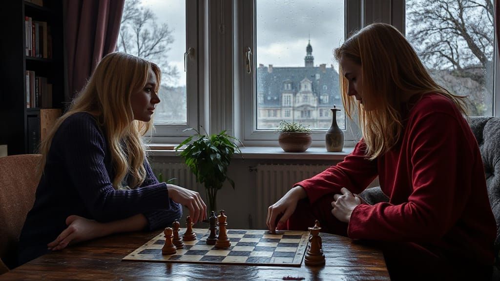 Swedish flat in Stockholm, Sweden. Pretty french blond young woman with very long hair, purple pull-over and purple trouser is playing chess with her swedish woman friend (with red clothes). It's raining outside. Intricate details, HDR, beautifully shot, hyperrealistic, sharp focus, perfect composition, ...