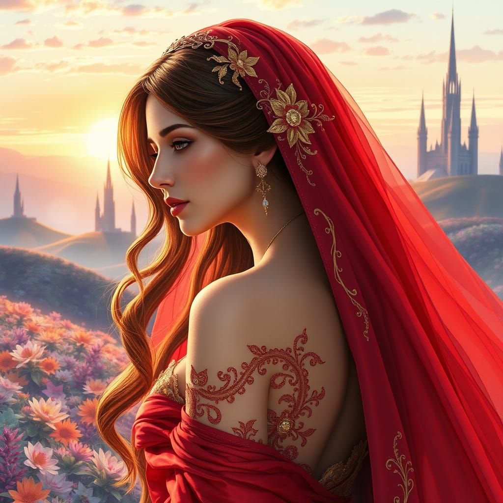 This stunning image showcases a majestic woman in a resplendent, crimson red gown with golden accents, set against a dreamlike landscape with rolling hills, vibrant flora, and intricate details, evoking a sense of elegance and whimsy.