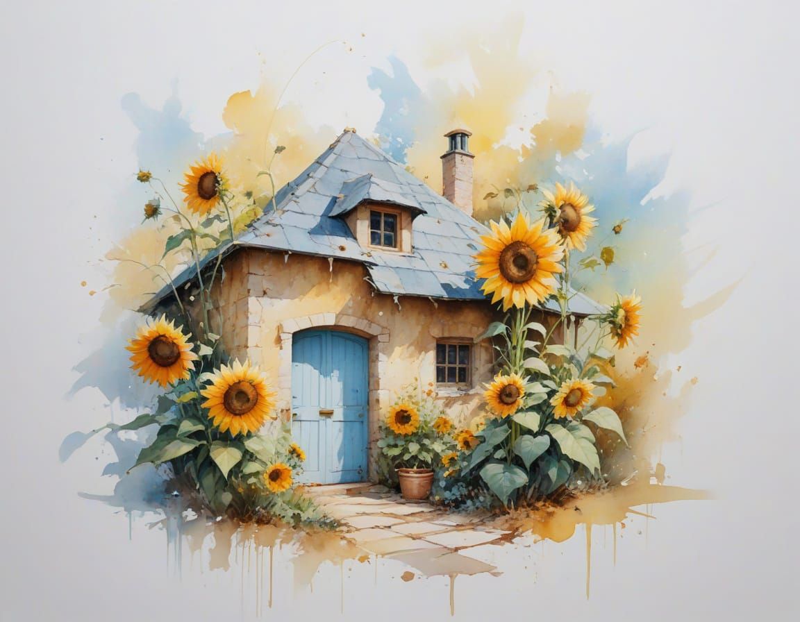 A charming miniature windmill cottage is nestled among enormous sunflowers, with a cobblestone path leading to the door. The scene is bathed in warm afternoon light and rendered in a delicate watercolour style.