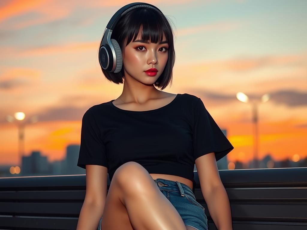 This image shows a stylish young woman with headphones enjoying music at sunset. She is sitting on a bench in a black crop top and denim shorts in a serene urban setting.