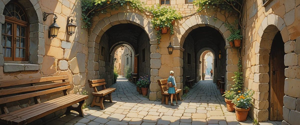 A vibrant folk art painting depicts a person walking through a mysterious passageway adorned with benches and tables. The whimsical illustration features delicate stone textures and soft pastel colors in warm sunlight.