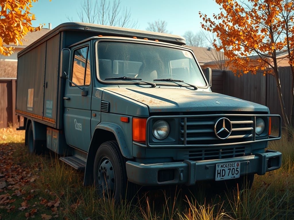 This image shows a nostalgic and photorealistic depiction of an old Mercedes truck, abandoned and rusty, yet surrounded by the warmth and vibrancy of a sunny backyard, complete with orange leaves and yellow grass, in a style reminiscent of classic sci-fi and fantasy art.