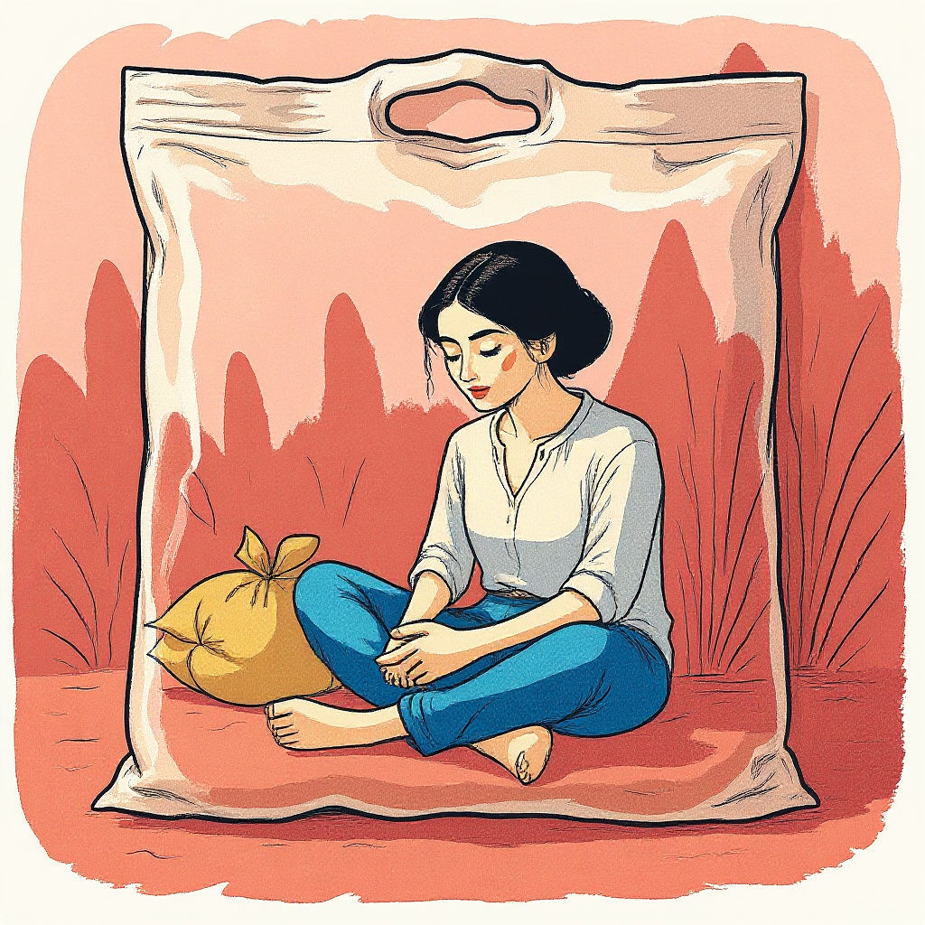 A delicate sketch of a serene person seated beside a wrapped bundle. Created in a hand-drawn style, the monochromatic image is designed as a template for acrylic painting.