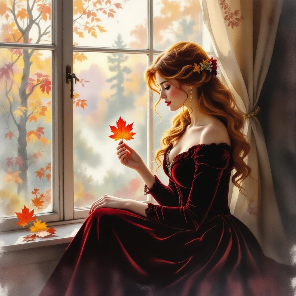 This image showcases a woman with auburn hair in a velvet gown by a window, with a misty autumn forest outside. Golden hour light creates a serene atmosphere in this watercolor masterpiece.