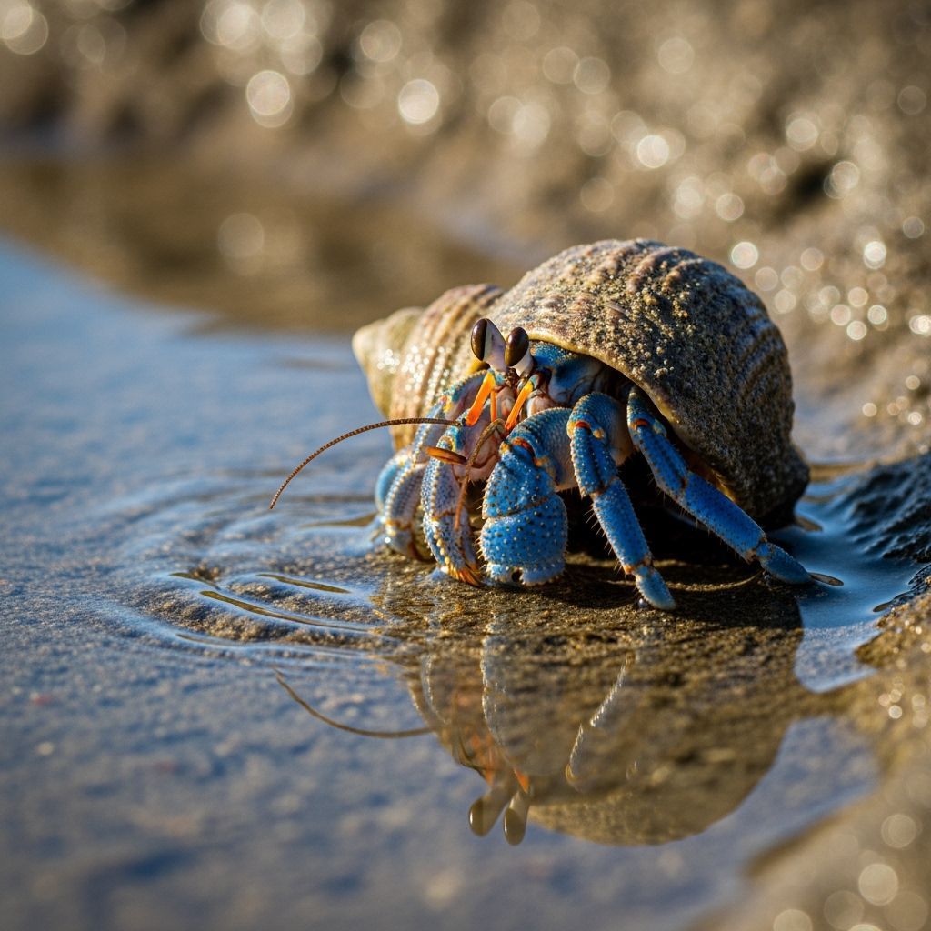 A close-up image shows a blue hermit crab exploring a tide pool. Captured in a photorealistic style, the image highlights shell details, water reflections, and the warmth of a sunny coast.