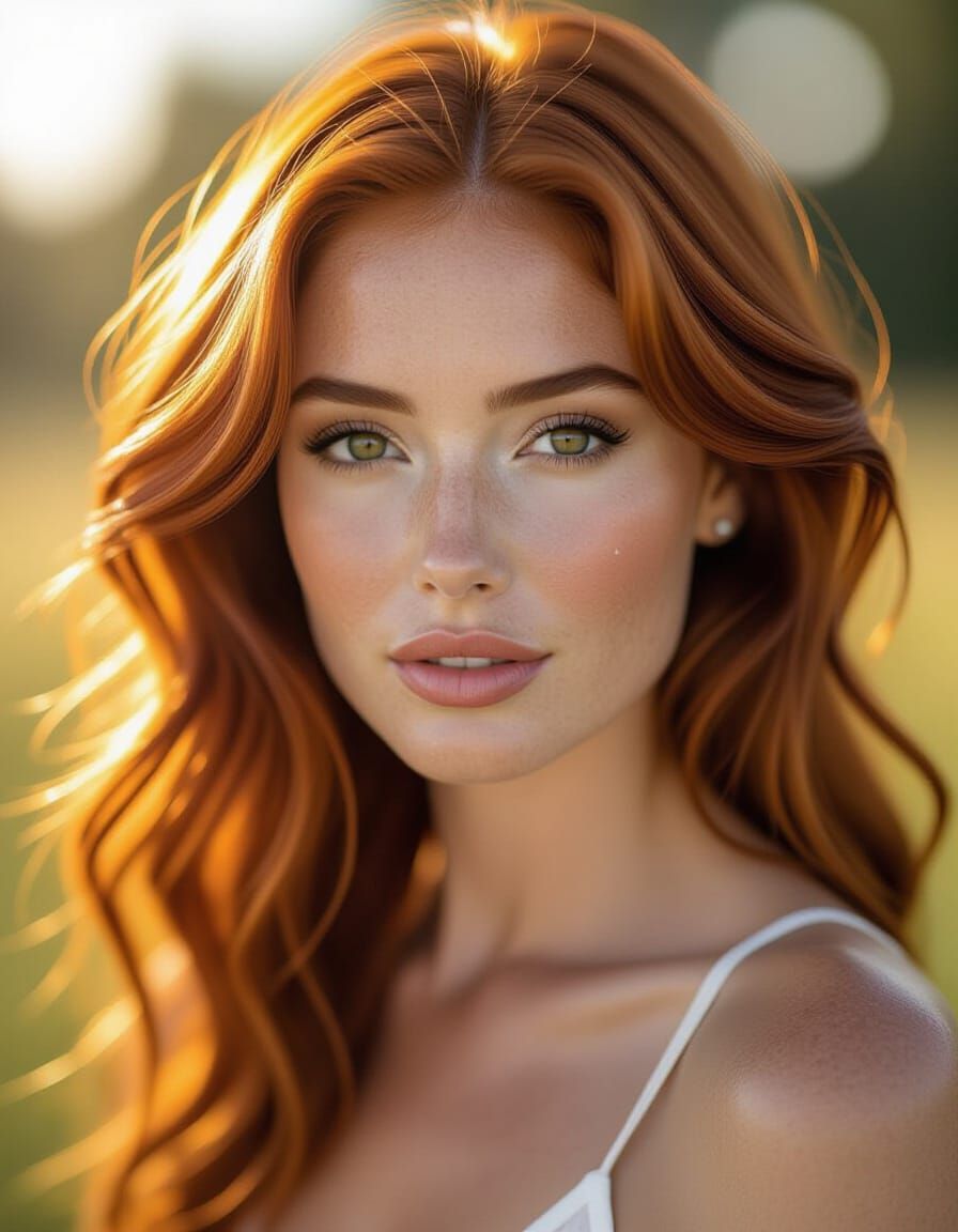 This image shows a beautiful woman with red hair and brown eyes. Soft morning light creates glistening droplets on her skin, with a shallow depth of field and bokeh background.