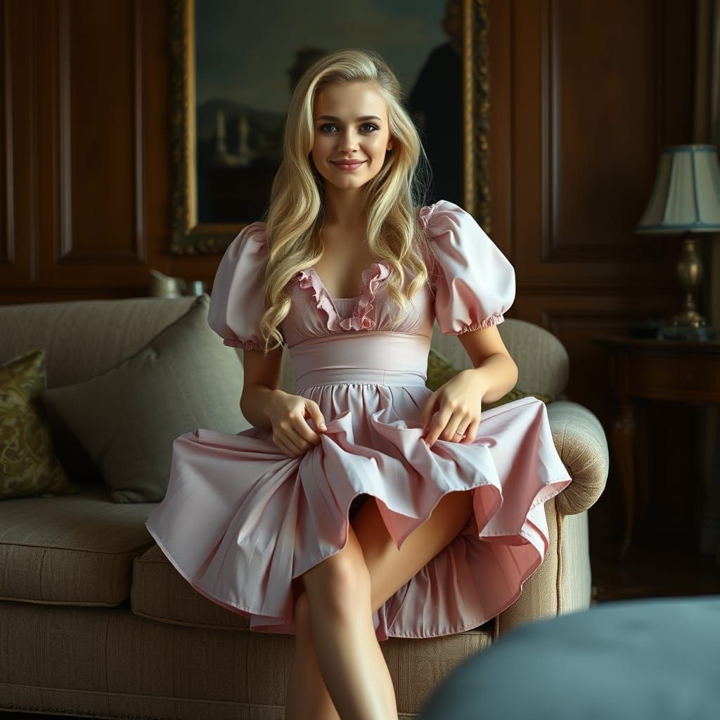 This cinematic image shows a young man with long blonde hair, wearing a miniskirt and frilly top, sitting on a couch and lifting his skirt. Captured with film grain and dramatic lighting.