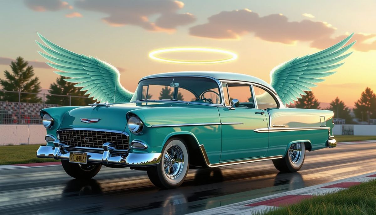 This image shows a customized 1955 Chevy Bel Air gasser with angel wing decals and a halo, detailed with turquoise scallops and moon hubcaps on a drag strip. It features a dreamlike, fantasy atmosphere with volumetric lighting.