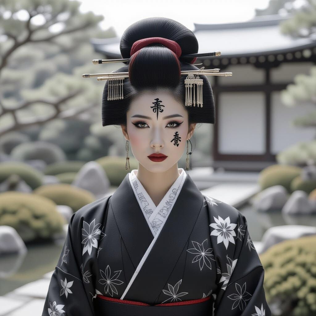 A black and white portrait of a woman with hieroglyphic hair decorations and calligraphic makeup, set in a minimalist Japanese garden. The image evokes a Zen atmosphere.