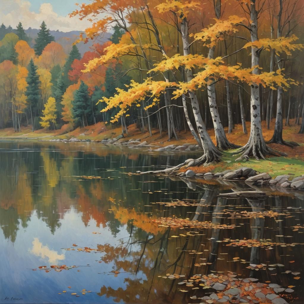 A striking picture of an autumnal lakeside scene. The artwork evokes Gurney's style through its realistic rendering and use of traditional oil painting techniques.