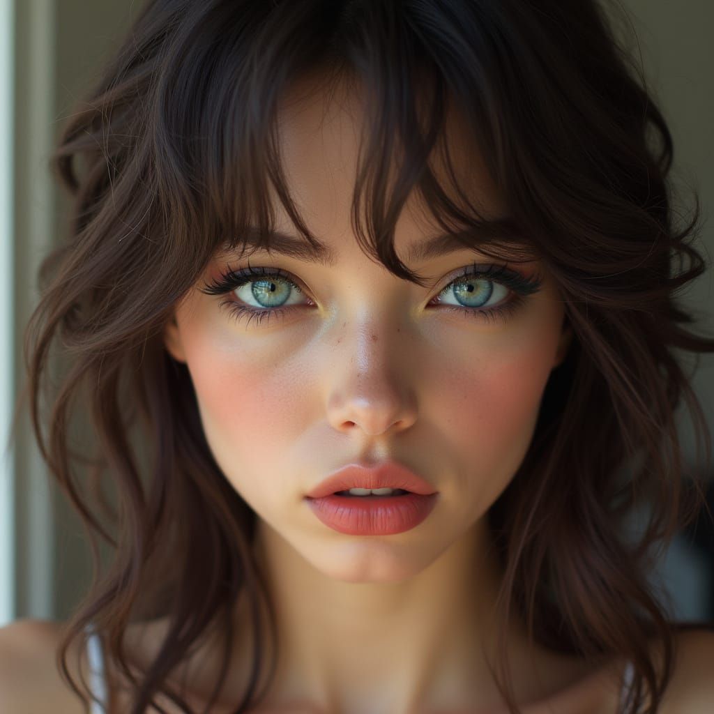 A striking picture of a brunette woman with blue eyes and full lips. The portrait features elegant makeup and is rendered with hyper-realistic detail and soft, natural lighting.