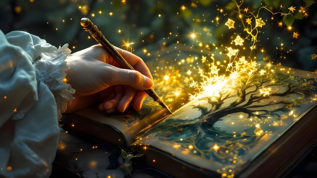 A striking picture of a hand using a fountain pen to draw an alchemical forest in an old book. Luminous colors and floating ink drops create a magical, hyperdetailed scene.