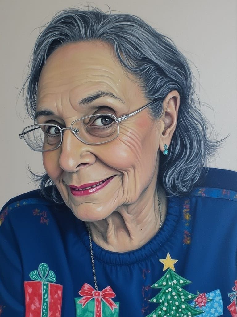 A heartwarming image of a mature woman embracing the festive spirit of Christmas, surrounded by decorations and joy.