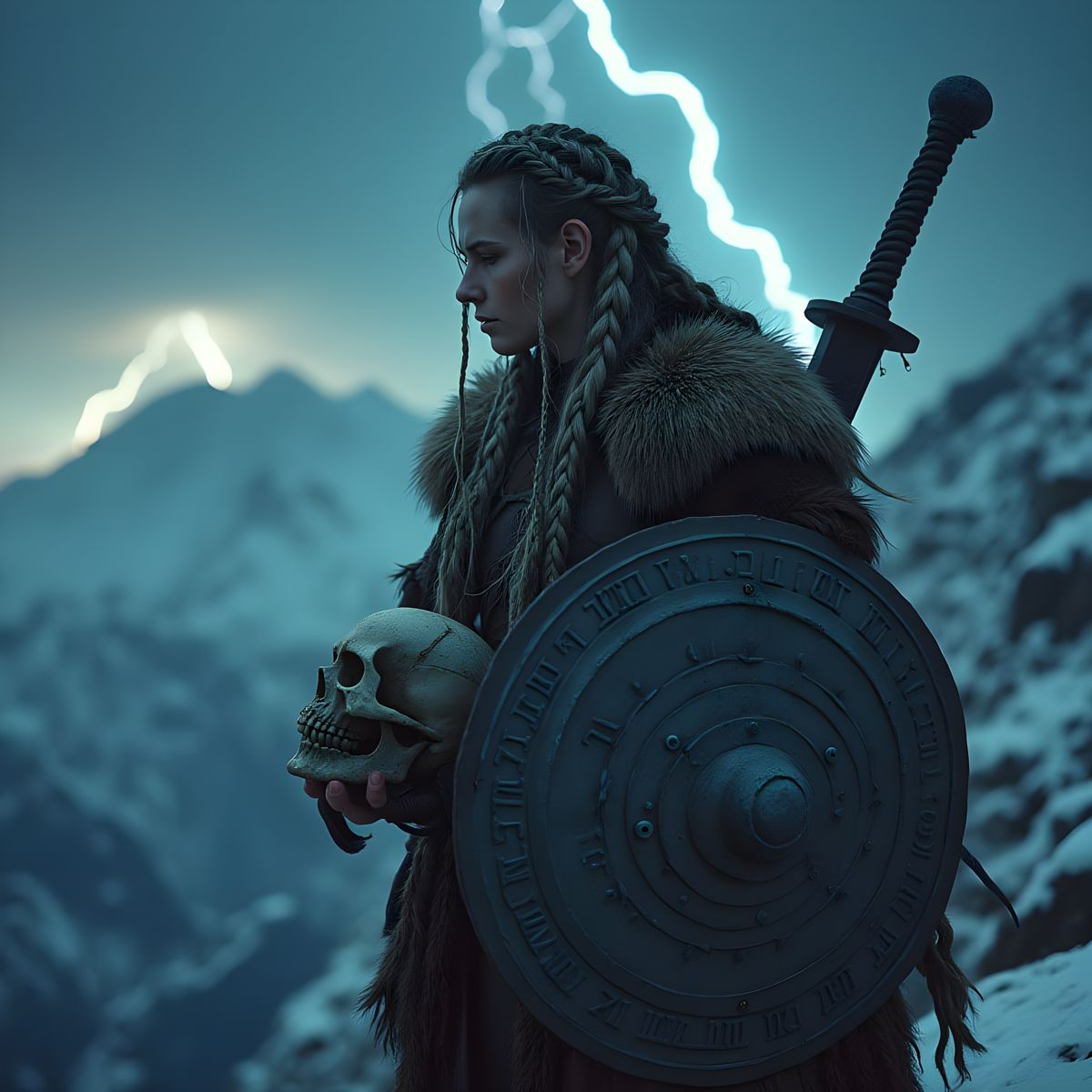 This image shows a regal Viking shield maiden standing atop a snow-capped mountain, her braided hair adorned with ribbons and her hand grasping a conquered enemy's skull. The scene is illuminated by a dramatic lightning-filled night sky, captured in a cinematic film still style with film grain and vignet...