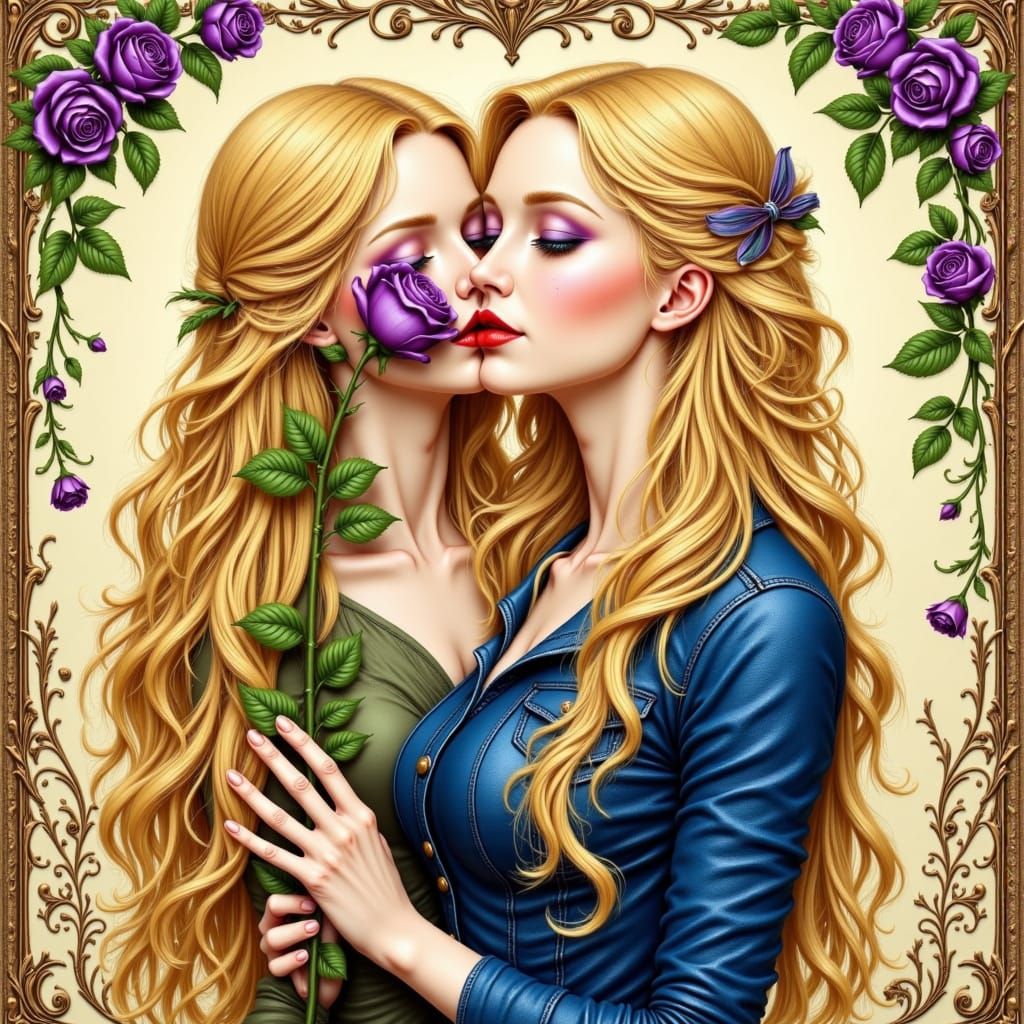A digital painting of a blonde woman with blue eyes, kissing a purple rose. The illustration features a warm color palette and evokes the artistic style of art nouveau.