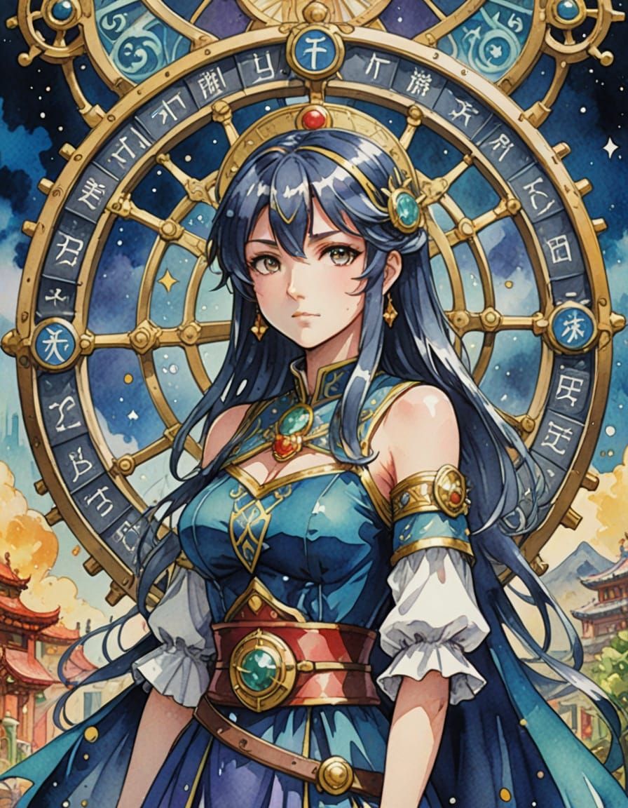 This image shows a beautifully rendered anime tarot card featuring the Wheel of Fortune in a stunning watercolor style, with deep colors and cinematic lighting, reminiscent of Studio Trigger's artwork.