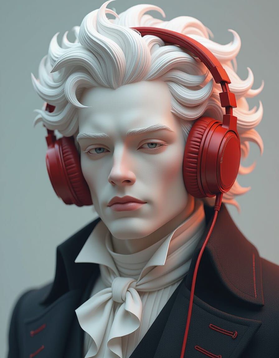 A surreal 3D digital artwork of Beethoven with porcelain skin and fiery headphones, rendered with cinematic lighting and vibrant colors for ultra-high definition.