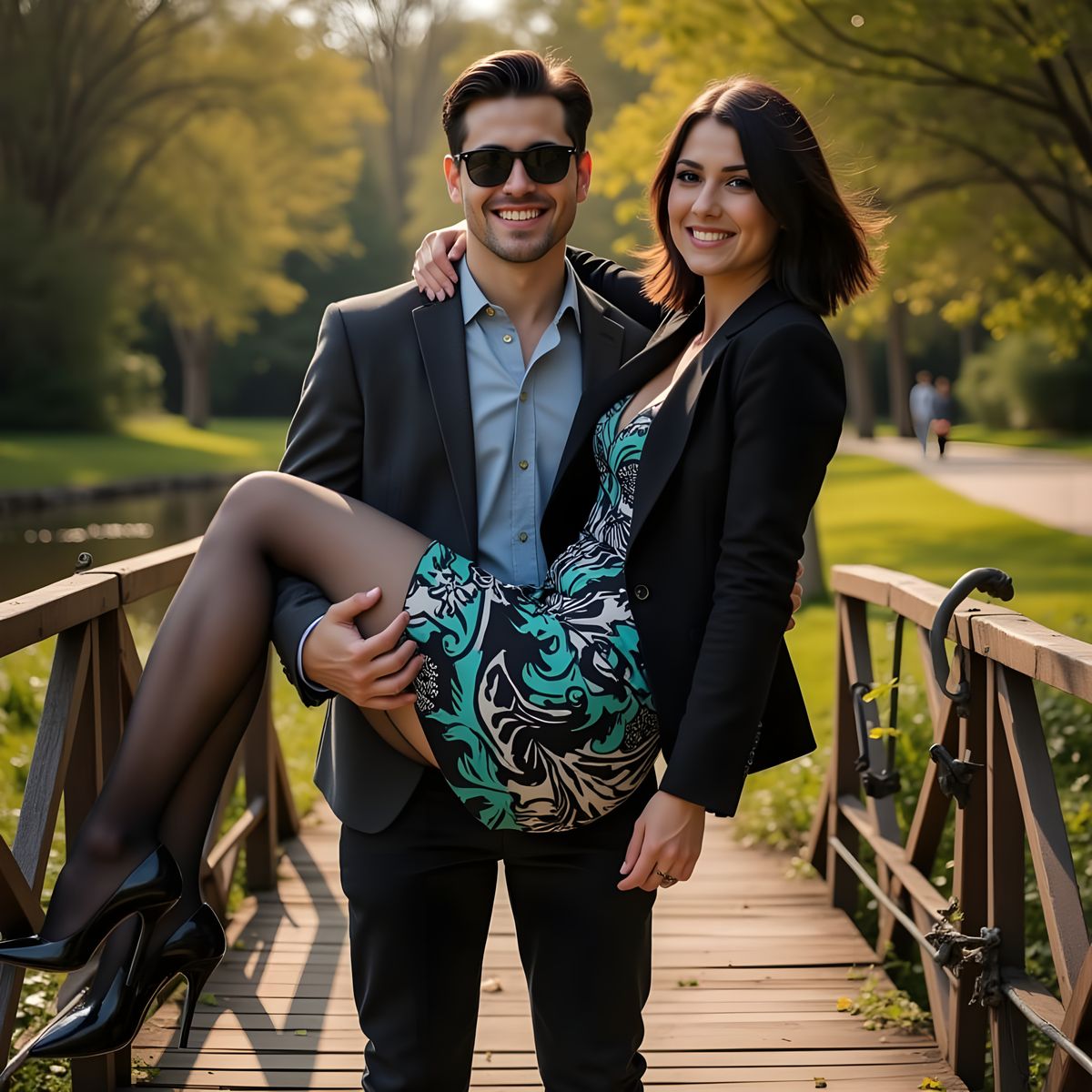 A couple enjoys a sunlit moment on a wooden bridge. The man wears a blazer and sunglasses, lifting the woman in a stylish patterned dress. Lush greenery surrounds them.
