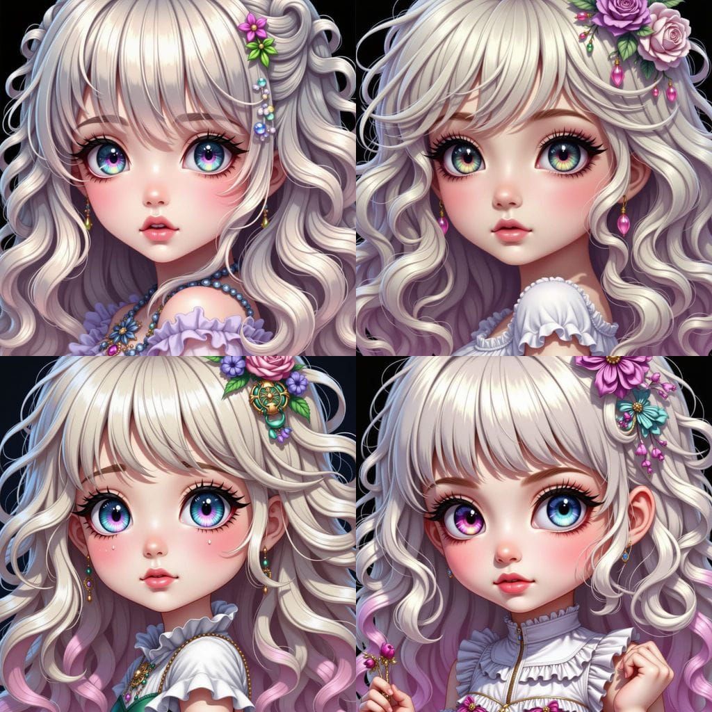 This image showcases an incredibly detailed and realistic chibi girl with flowing white hair. The artwork is vibrant and captures a cute, pretty aesthetic.