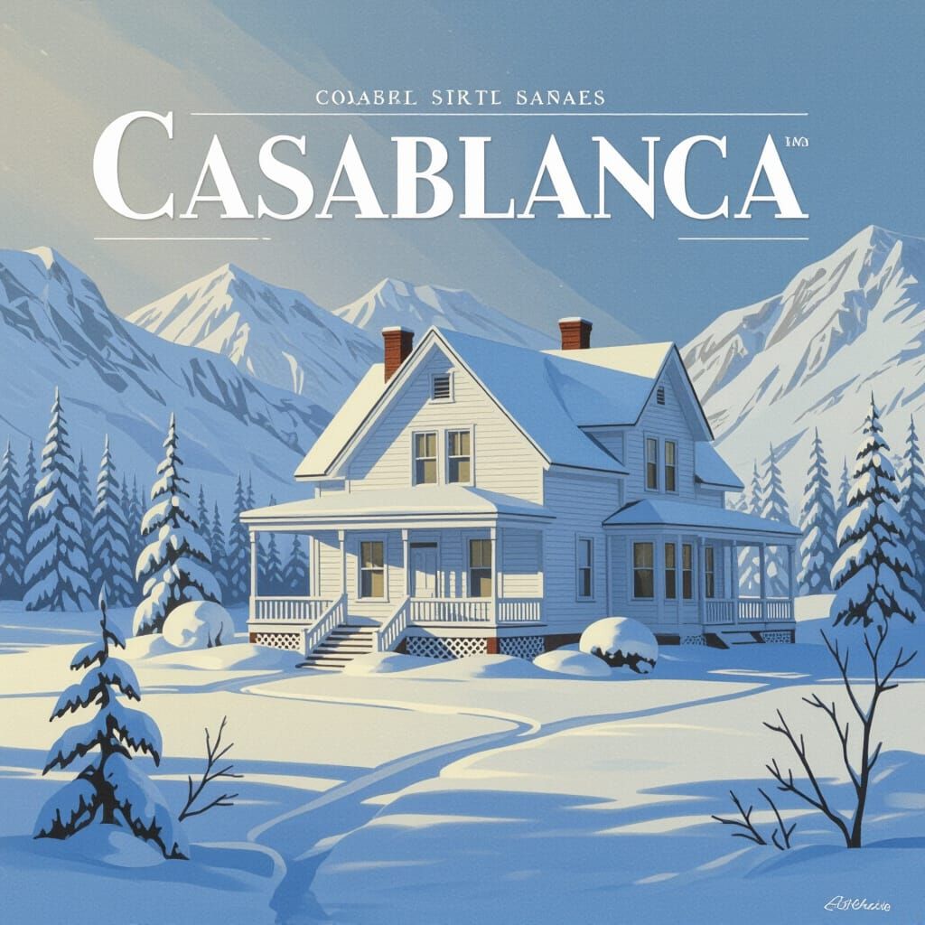 A striking film poster featuring a white house in snowy Alaska, with 'Casablanca' in vintage text. Cinematic lighting creates a mood of serene isolation.