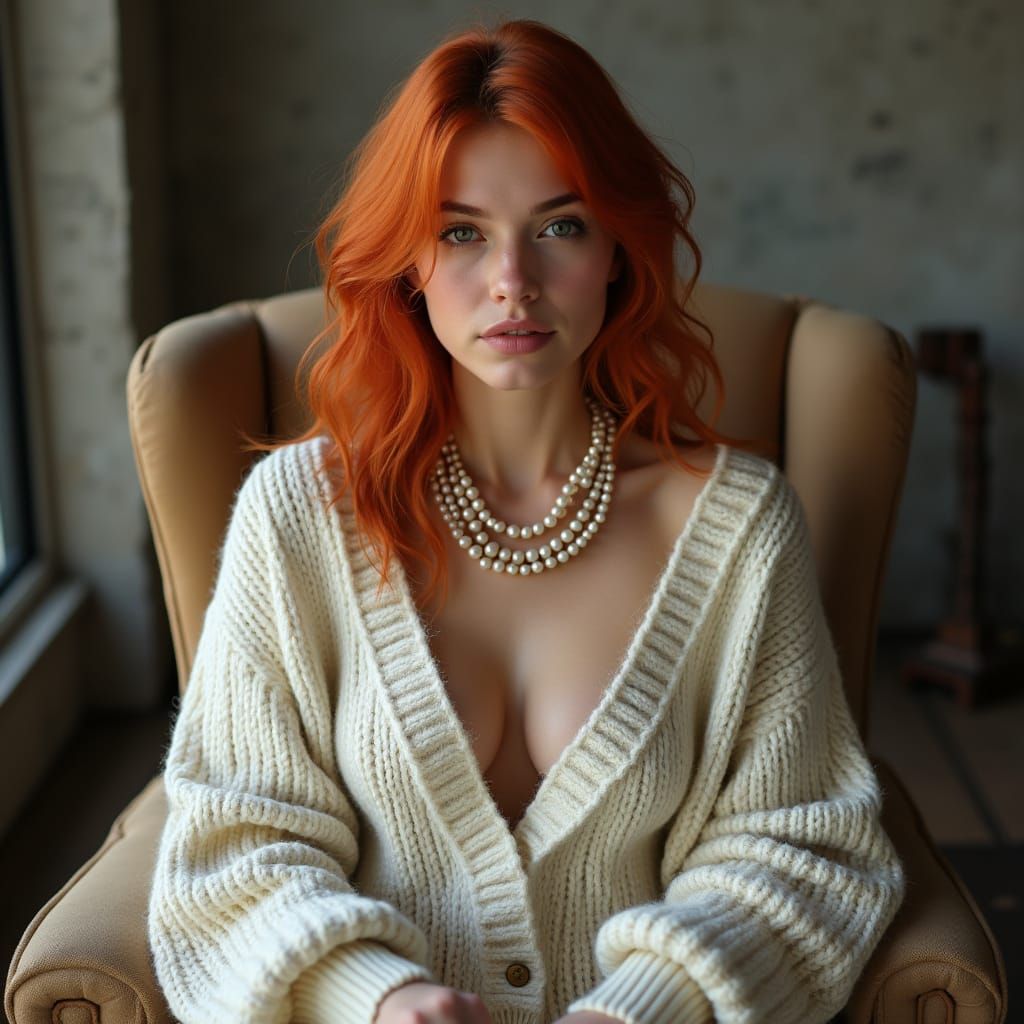 A portrait of a red-haired woman wearing a white sweater and pearls, seated in a chair. The image evokes art nouveau and anime influences with moody lighting.