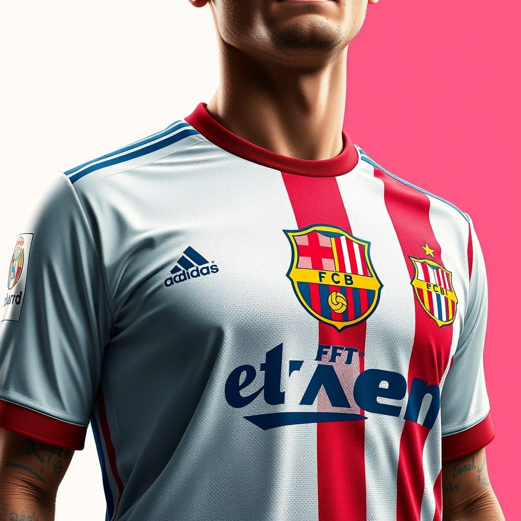 This hyperrealistic image shows the iconic jerseys of Real Madrid and Barcelona merged, with both teams' logos prominently displayed in a striking fusion of style and detail, inspired by the works of Syd Mead and Ash Thorp.