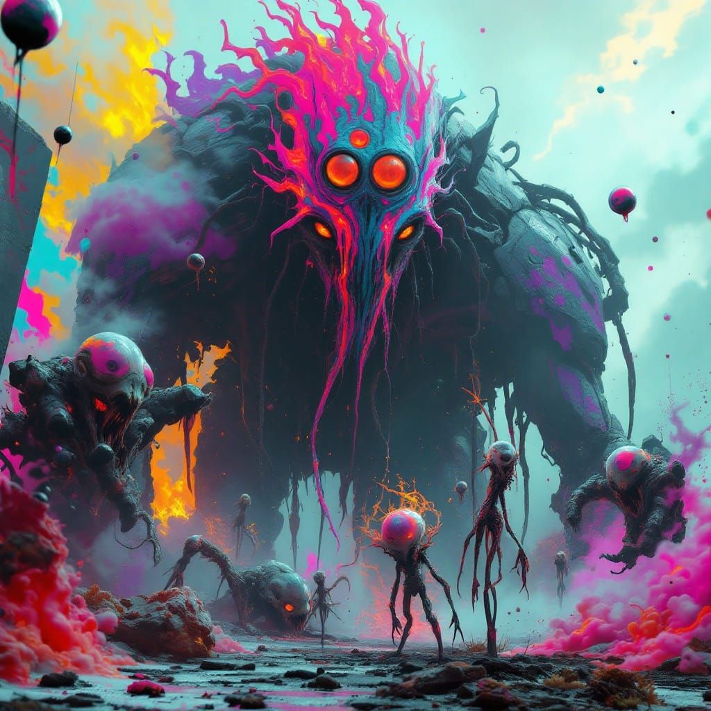 This image shows a mesmerizing, otherworldly scene of a vampire badger warlord surrounded by melting faces and twisted, elongated beings. A massive mural of a neon-lit mech droid dominates the background, blending biomechanical and gothic surrealism in a hallucinatory aesthetic.