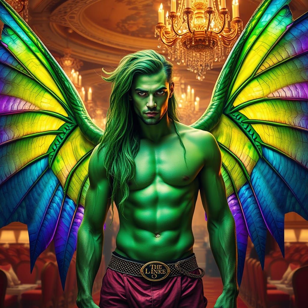 This image shows a stunningly handsome figure with vibrant green skin and a mesmerizing aura, surrounded by opulent decorations and a kaleidoscope of colourful wings, as if born from the spirit of Greek mythology