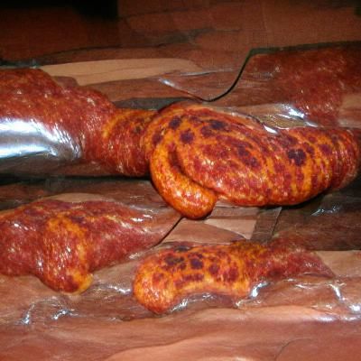 This image shows a chorizo sandwich, a popular Spanish tapa. The sliced chorizo sausage is nestled inside a crusty bread roll, ready to be enjoyed as a savory snack.