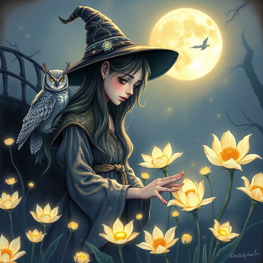 A young witch with celestial hair adornments tends a moonlit garden of glowing, otherworldly flowers. Her spectral owl familiar watches from her shoulder in a dreamlike fantasy style with painterly textures.