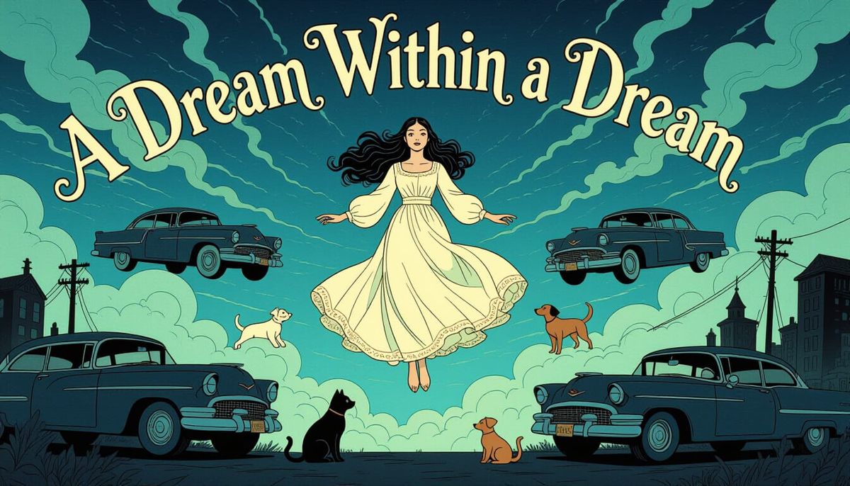 This image shows a woman floating in the air amongst clouds and levitating objects. The scene, reminiscent of a surreal dream, is set against a dystopian backdrop with dramatic shadows, and is in a graphic novel art style.