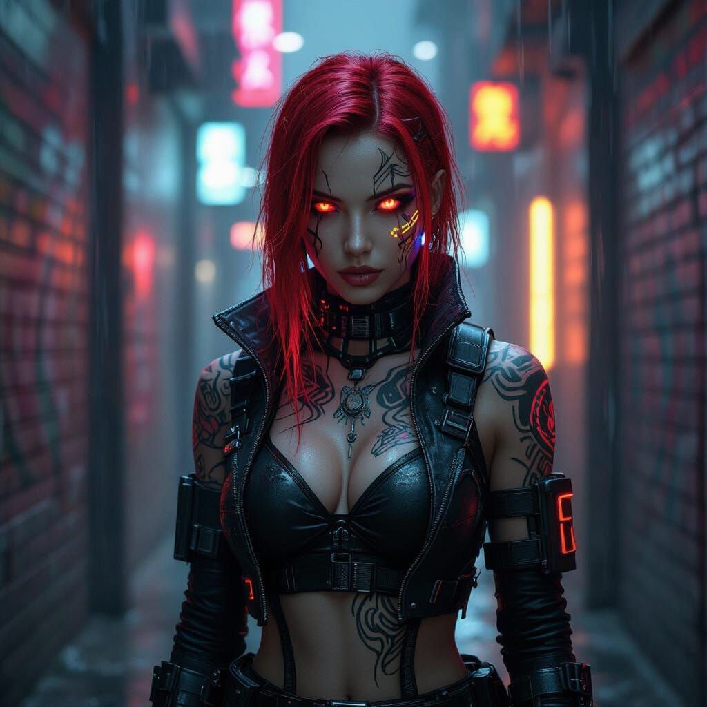 This image shows a cyberpunk warrior with red hair and tattoos in a neon alleyway. The scene blends gritty realism and futuristic fantasy with cinematic lighting in a cyberpunk aesthetic.