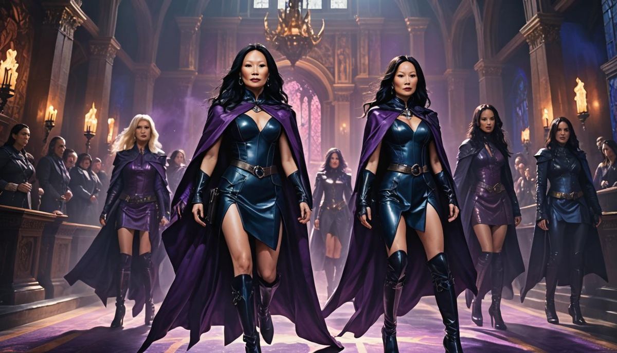 This image shows a group of powerful witches, led by a figure resembling Lucy Liu, assembled in a mystical chamber. The witches wear latex, capes, and leather boots, rendered with hyperrealistic detail and vibrant colors.