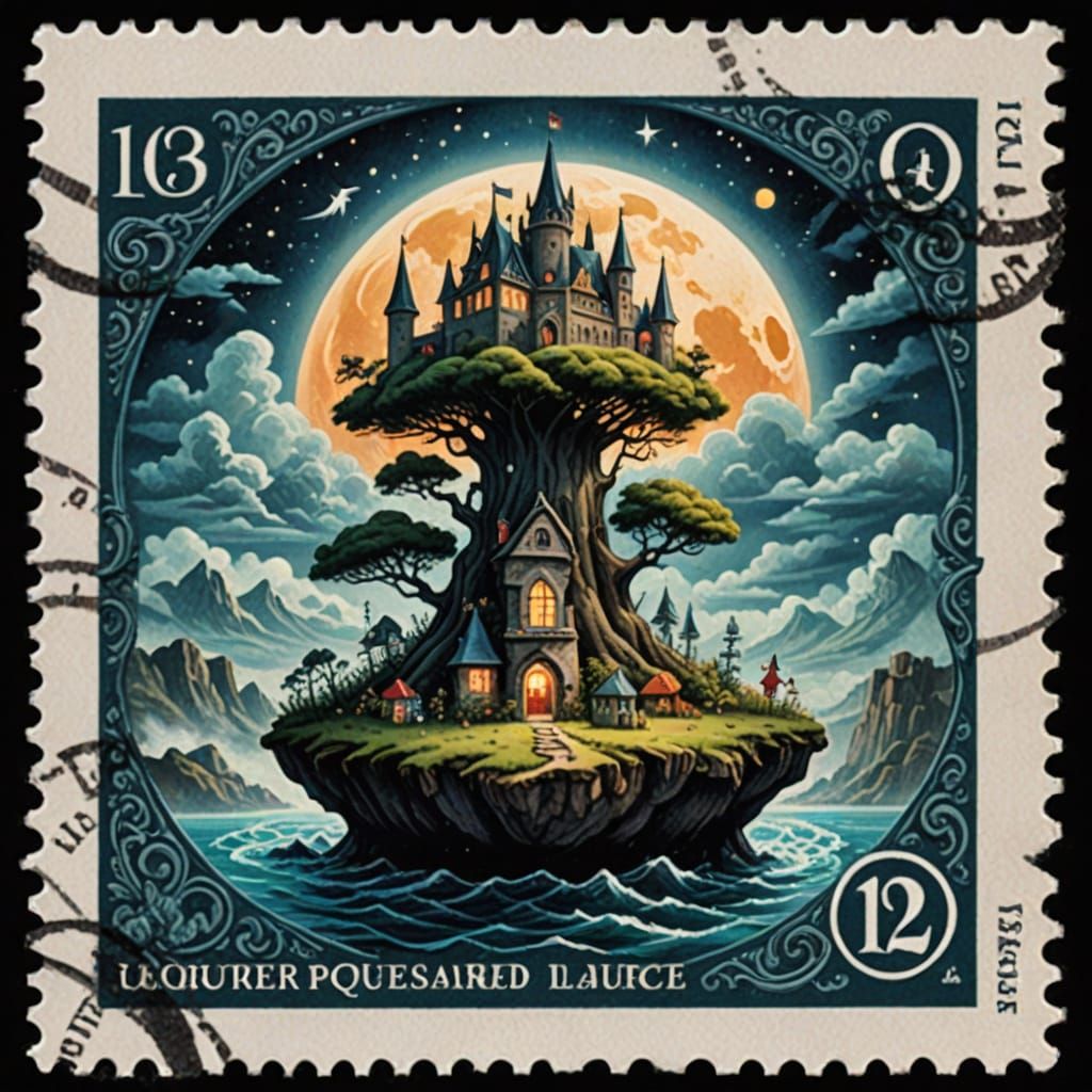 A surreal postage stamp on a magical letter. The image shows a whimsical and enchanting design, perfect for adding a touch of fantasy to any correspondence.
