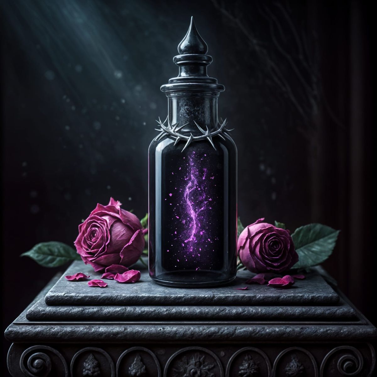 A captivating image displays a dark fantasy alchemical reagent within a black glass vial. The vial contains a shimmering, deep violet liquid, accented by wilted roses in a melancholic, ethereal aesthetic.