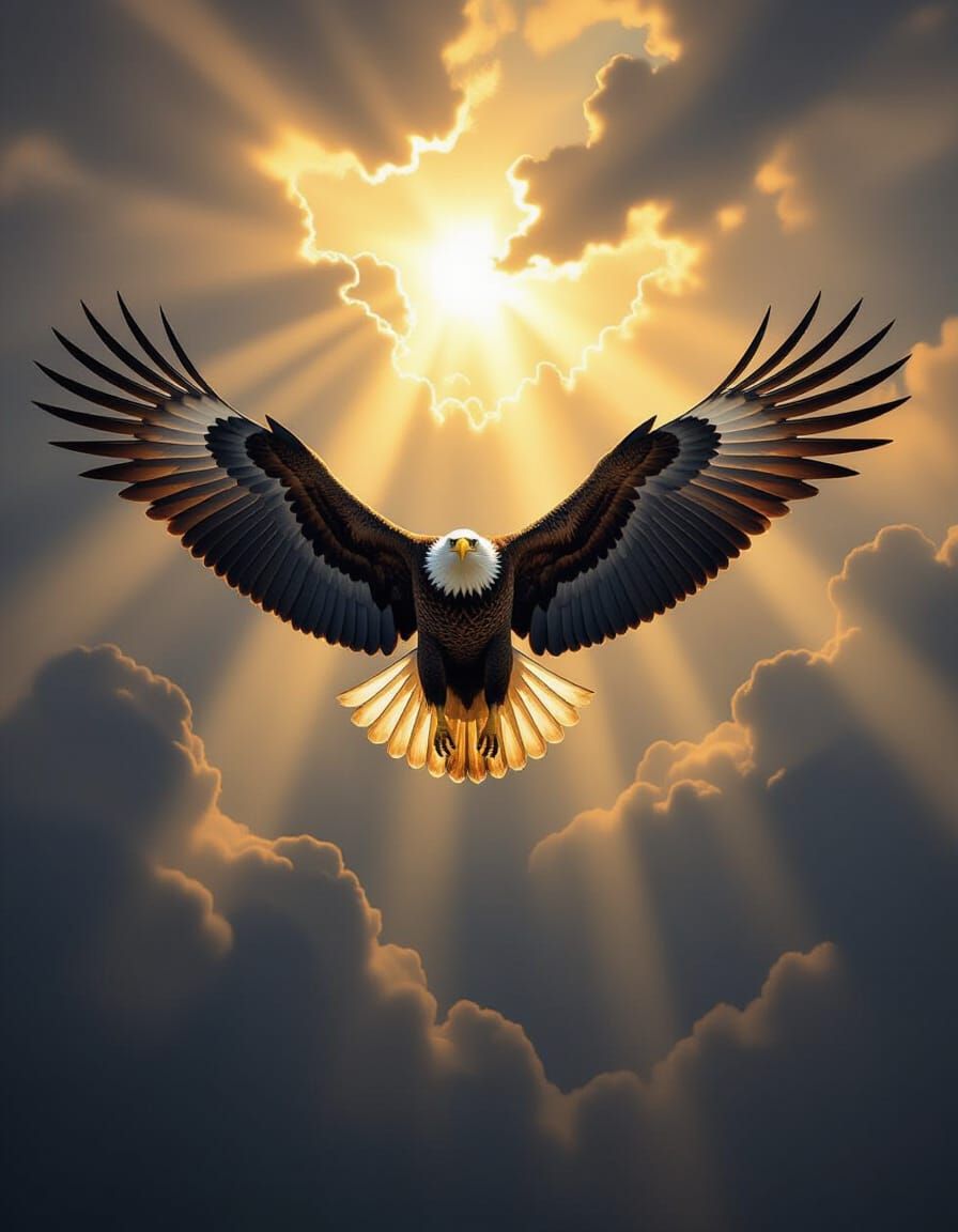 This image shows a majestic eagle with vast wings flying through dark, stormy skies. Golden light pierces the clouds, highlighting the bird in a dramatic, high-contrast style reminiscent of romantic landscape painting.
