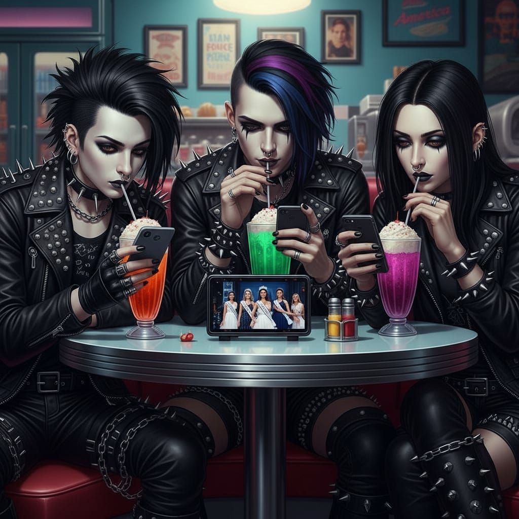 This image features three young people dressed in goth fashion, relaxing in an ice cream parlor while drinking sodas and watching a screen.