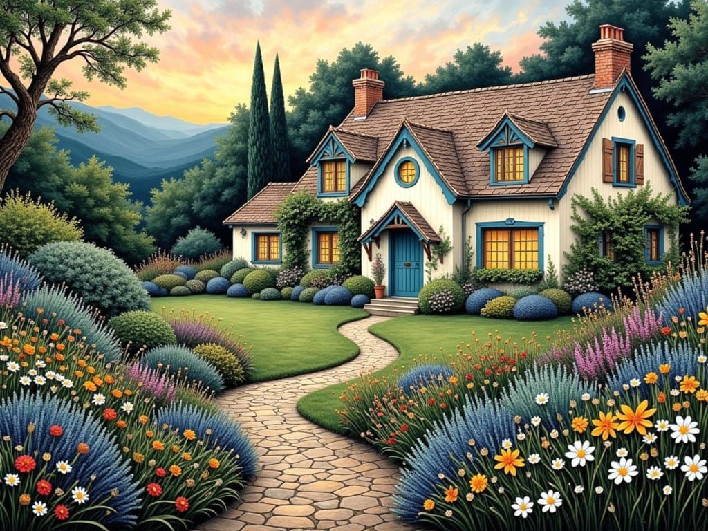 This charming image features a cozy cottage surrounded by an abundance of colorful wildflowers, meticulously rendered in a detailed watercolor style.