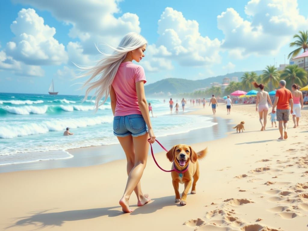 This vibrant caricature shows a thin woman with long white hair and a pink shirt walking a small Maltese dog on a sunny beach boardwalk. The image features bright, colorful details.